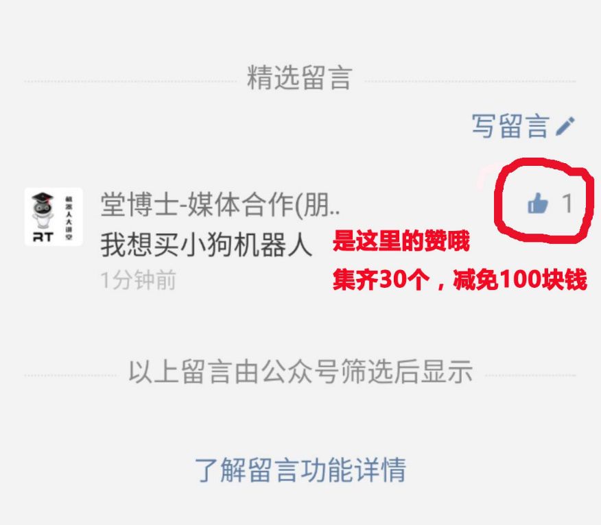 机器人大讲堂为了回馈广大粉丝对大讲堂的厚爱,我们也有相应的减免活动。只要您将这篇文章转发到朋友圈,并在文章底部留言(我想买XXX机器人),并集齐30个赞,去微店购买以下商品,我们都会主动联系您,为您返还100元现金哦。