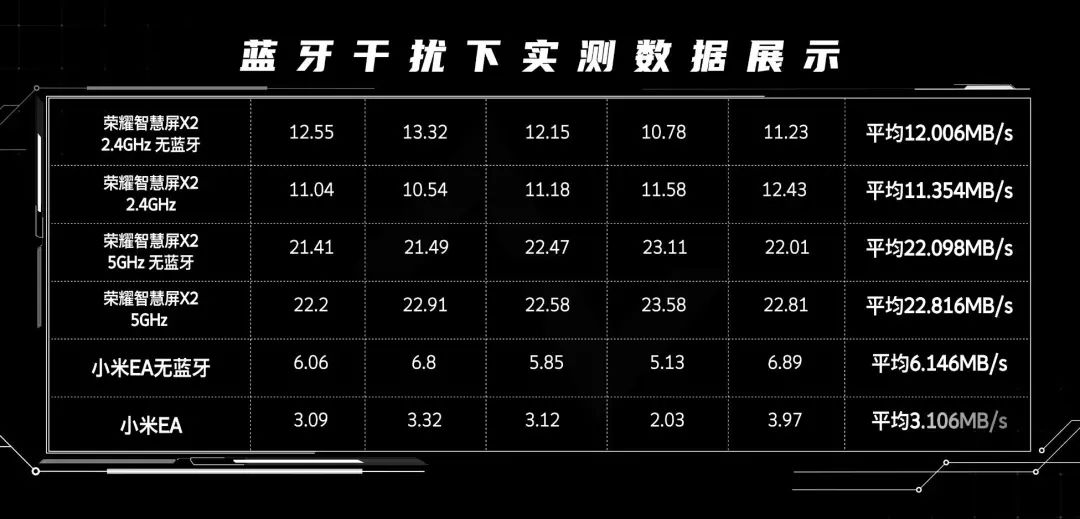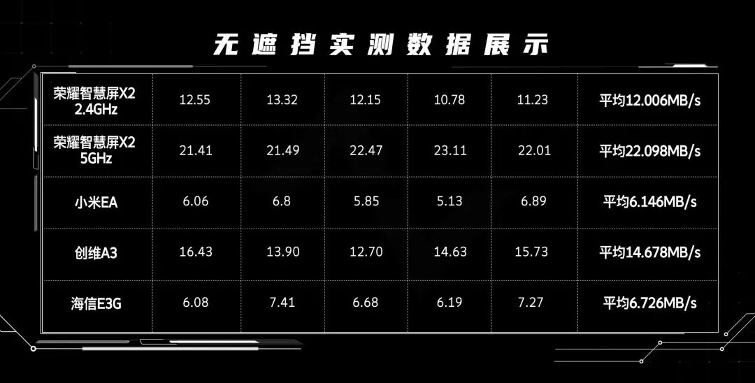 每款产品我们都测 5 次取平均值,在无明显遮挡的情况下,2.4GHz 网络下网速最佳的是创维 A3,荣耀智慧屏 X2 紧随其后,小米 EA 和海信 E3G 都仅有前者一半左右的网速,还不及手机4G网络的速度,而荣耀智慧屏 X2 切换到 5GHz 频段之后,平均网速接近翻倍,平均达到了 22MB/s,在这种速率下,即使是非常高清的在线视频资源,也不在话下。