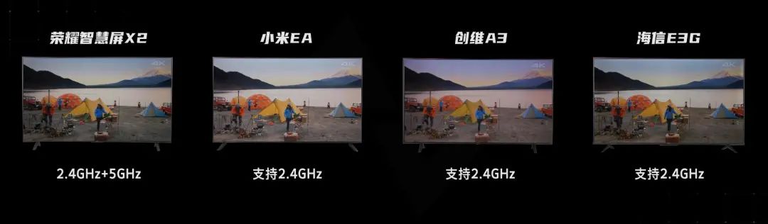 而前面说到的电视短距传输性能,配置最好的是荣耀智慧屏 X2,其他 3 款网络都只支持 2.4GHz,而荣耀智慧屏 X2 使用的是 MT7668AU 芯片,支持速率更高的 802.11ac 协议的 WIFI5,也就是能使用 2.4GHz+5GHz 双频段,虽然是 2*2MIMO 的天线,但纸面参数也比其他三位选手强劲很多,能支持 DBDC 双频并发处理,在路由和网速不成瓶颈的情况下,这四位的短距传输性能会有多大差异呢?