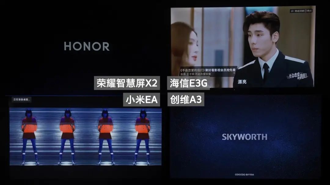 四台电视的处理芯片用的都是能效比较高的 Cortex-A 系列,售价较高的创维 A3 用的芯片最好,荣耀智慧屏 X2 和海信用的都是 A53,小米 EA 次之,内存方面小米 EA 和海信 E3G 一致,都是 1.5GB 运存+8GB 的配置,荣耀智慧屏 X2 和创维 A3 都是 2+16GB,大家看大片时都够用,不会卡顿,运行起来差距也不大。