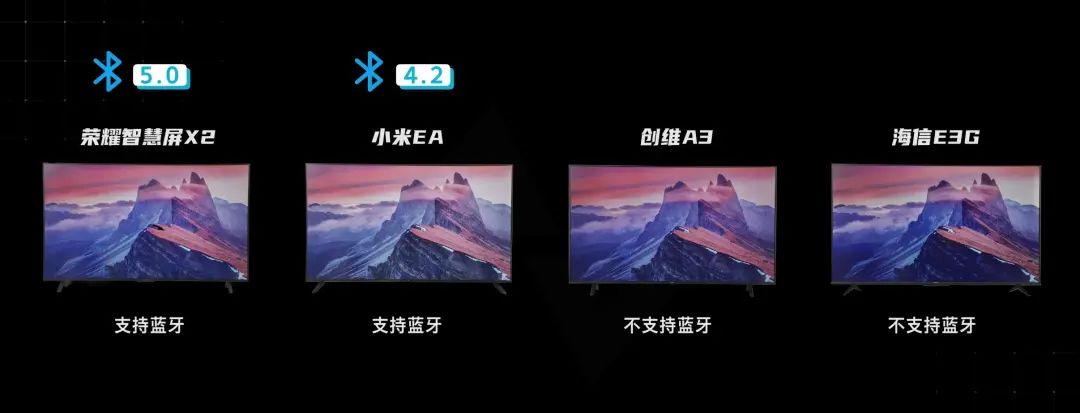 4 台电视只有小米和荣耀搭载了蓝牙芯片,不过小米的蓝牙协议是 4.2 版的,而荣耀是比较新的 5.0,同时荣耀智慧屏 X2 还给蓝牙配置了独立的天线,避免和 Wi-Fi 共用时产生干扰,为什么这样说,来看测试。