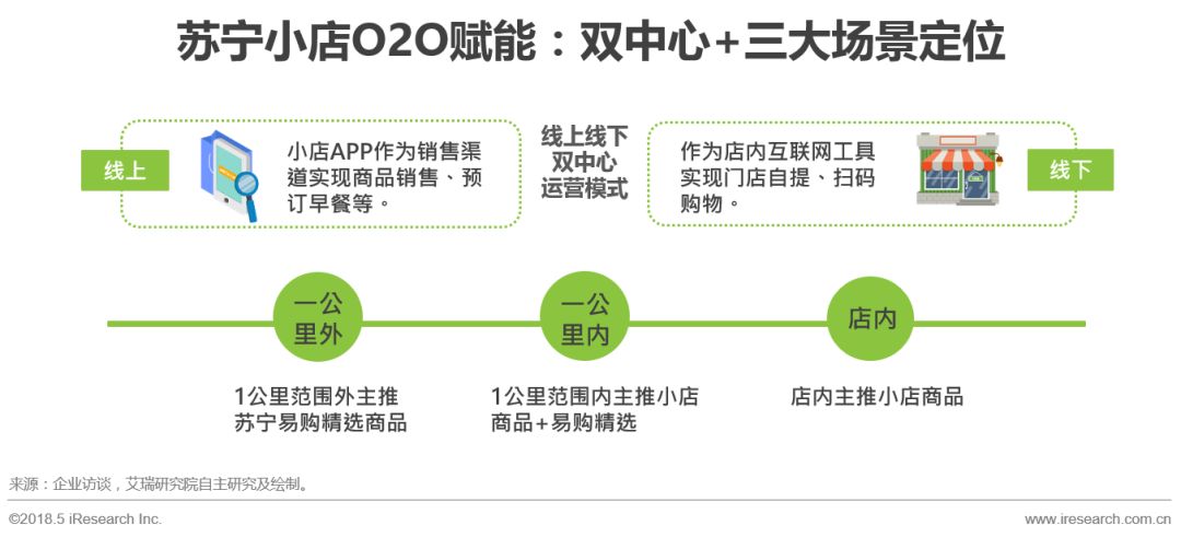 就苏宁小店的整体业务模式而言,其最为突出的特征在于对传统便利店进行O2O赋能:以“双中心+三大场景定位”为内核,根据用户行为特征锁定用户所在场景,并通过供应链优势将上述场景打通。O2O模式本质上是消费升级的体现,其核心价值在于提升消费的便利程度。苏宁小店通过线上线下双中心运营模式,将线上线下渠道有机融合,并通过对用户场景的定位提供针对性解决方案,实现便利店业态功能价值的提升,更好地满足消费者需求。就三大场景定位而言,根据用户所处消费场景的不同分别提供解决方案。其中,在1公里范围外主推苏宁易购精选商品,1公里范围内主推小店商品+易购精选,店内主推小店商品。 通过苏宁供应链优势满足用户在不同场景下的需求。