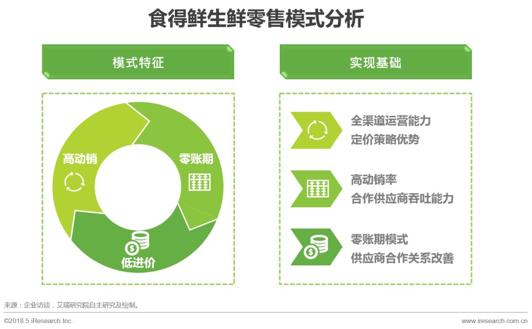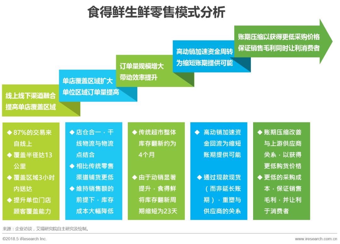 传统生鲜零售的市场覆盖成本由租金成本、库存成本,以及门店运营成本等部分构成。上述成本结构自身暗含着低效的成分,因而行业效率的提升自然从改善原有成本结构入手。就具体措施而言,食得鲜进行了如下探索:首先,全渠道运营以及自建物流配送体系。上述举措旨在提升单位门店顾客覆盖能力,变相降低租金成本、库存成本及门店运营成本,同时有效提升动销率。其次,与上游供应商关系的改善。与多数传统零售商不同,食得鲜在采购环节采用现款现货模式,以此获得更低的购货价格,在保证销售毛利同时,以更低的定价将商品提供给消费者。