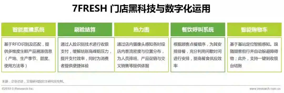 在门店管理与到店体验方面,7FRESH采用了诸多“黑科技”应用。店内黑科技的运用主要基于两类用途:门店管理、购物环节体验优化。其中门热力图分析是门店管理中最具代表性的数字化运用之一,主要解决客流时间空间分布的监测,为门店运营数据洞察提供依据;购物环节体验优化覆盖购物行进、单品消费决策、结算支付、店内候餐等环节,为顾客提供智能化购物体验。