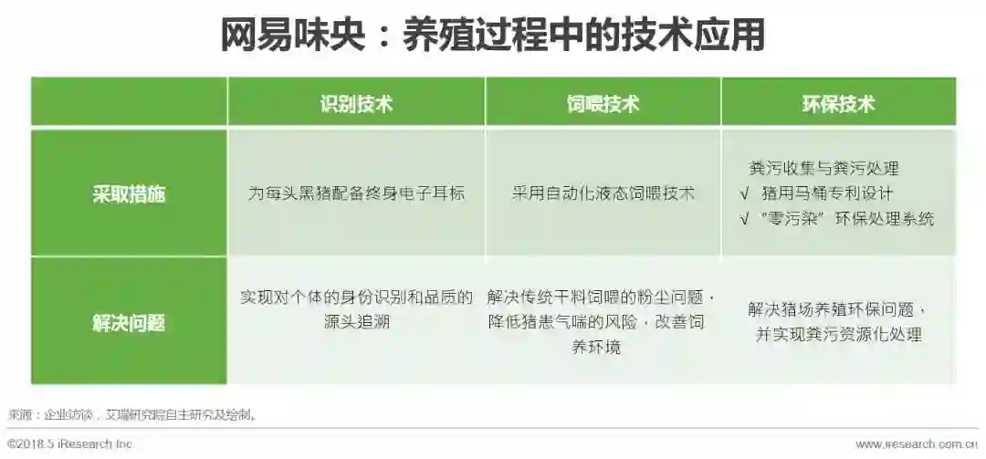 就生产养殖过程而言,网易味央采用多种新技术应用,分别针对传统养殖过程中的痛点进行了改善。首先,通过电子耳标身份识别追踪解决了品质溯源问题;其次,在饲喂方面采用液态饲喂技术,在降低猪患哮喘的风险同时很大程度上改善饲养环境。此外,在粪污收集与处理方面,创新性采用猪马桶技术与“零污染”环保处理系统,从根本上改善养殖环境,进而为猪肉及其制品的品质提供保障。