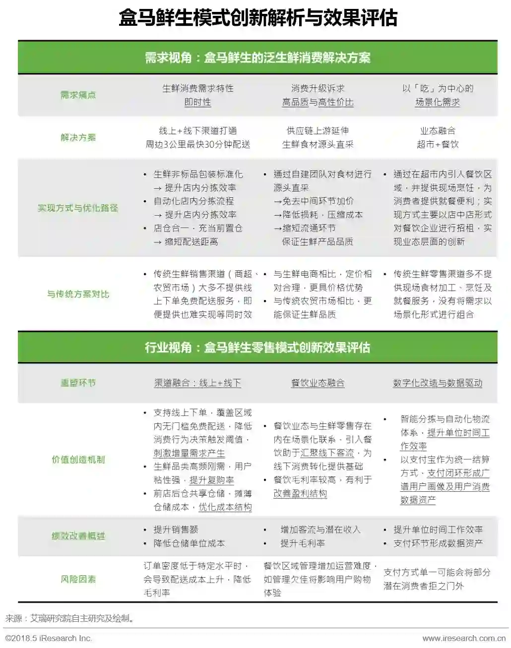 就经营模式而言,盒马区别于传统生鲜零售渠道和纯线上生鲜电商;盒马生鲜采用门店(超市+餐饮)+线上模式,通过打通线上线下及业态创新融合,为消费者提供即时便捷、高品质、场景化的泛生鲜消费解决方案。以下分别从消费需求视角与零售行业视角,对盒马鲜生提供的解决方案与经营模式重塑进行分析。