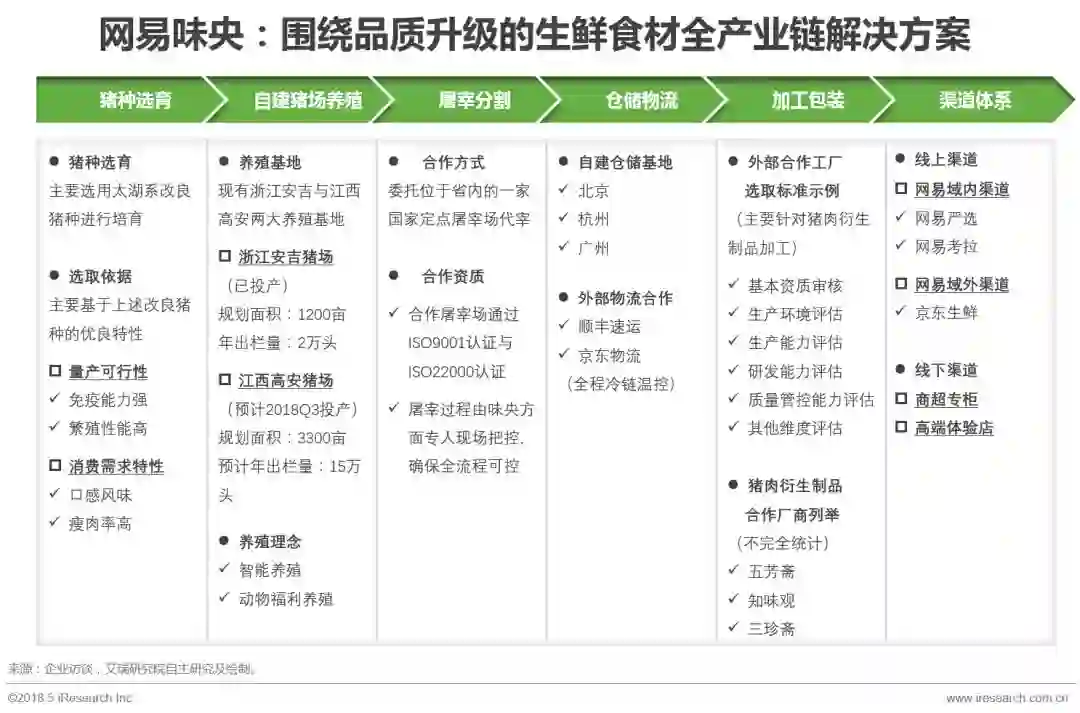 就供应链而言,网易味央在猪种选育与养殖环节完全自控,以确保生产源头品质;在屠宰分割与包装加工环节,主要通过外部合作实现,但在合作方资质审核与选取标准方面严格执行,以确保中间环节全程可控;在仓储物流与渠道体系建设方面,将内部资源与外部合作相结合,充分结合网易自身与外部合作方的相对优势,以实现流通与销售环节的品控与效率提升。