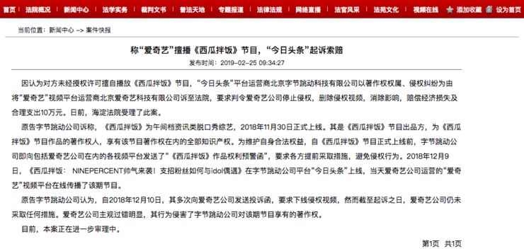 据悉,2018年12月9日,《西瓜拌饭: NINEPERCENT帅气来袭!支招粉丝如何与idol偶遇》在字节跳动公司平台“今日头条”上线,当天爱奇艺公司运营的“爱奇艺”视频平台在线传播了该期节目。原告字节跳动公司认为,爱奇艺公司主观过错明显,其行为侵害了字节跳动公司对该期节目享有的著作权。(海淀法院网)