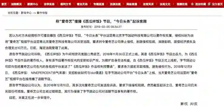 雷锋网消息,2月25日,根据海淀法院官网显示,因认为对方未经授权许可擅自播放《西瓜拌饭》节目,“今日头条”平台运营商北京字节跳动科技有限公司以著作权权属、侵权纠纷为由将“爱奇艺”视频平台运营商北京爱奇艺科技有限公司诉至法院,要求判令爱奇艺公司停止侵权,删除侵权视频,消除影响,赔偿经济损失及合理支出10万元。日前,海淀法院受理了此案。