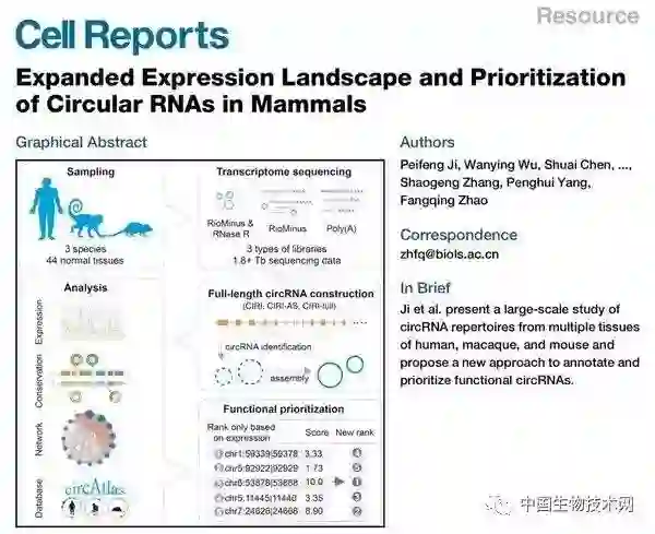 3月19日,国际学术期刊Cell Reports 在线发表了中国科学院北京生命科学研究院计算基因组学实验室赵方庆团队题为Expanded expression landscape and prioritization of circular RNAs in mammals 的研究成果。该研究从人、猴和小鼠三个物种的44个正常组织中鉴定出大量环形RNA,其中超过70%的环形转录本实现了全长重建。利用这些数据,研究人员对环形RNA的多样性、保守性、剪接模式以及与线性RNA的成环比差异进行了多方位深入分析。研究人员还通过构建物种特异和保守的环形RNA和mRNA共表达网络,筛选具有潜在生物学功能的环形RNA。该研究为环形RNA领域的研究者提供了丰富的数据资源和高效筛选功能环形RNA的方法,对进一步深入了解环形RNA的功能和作用机制具有重要意义。