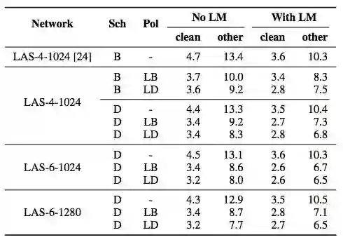 在下图中,“Sch”表示学习率的选取,“Pol”表示增强策略。可以看到,有6层LSTM和1280个词嵌入向量的LAS模型取得了最好的效果。