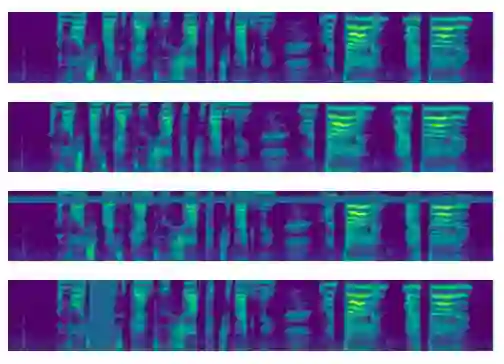 上图展示了对数梅尔频谱图的多种调整,从上到下分别是不做增强的原始图,时域调整,频谱覆盖以及时域覆盖。(Park et al., 2019)