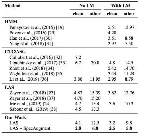 Park等人使用LAS结构来验证数据增强的效果,该结构包含两层卷积神经网络(CNN),一个注意力层(Attention)以及一个双向的长短期依赖(LSTMs)。 因为本文主要关注数据增强,模型只是验证增强效果的方法,如果你想深入的了解LAS,可以点击原文查看。