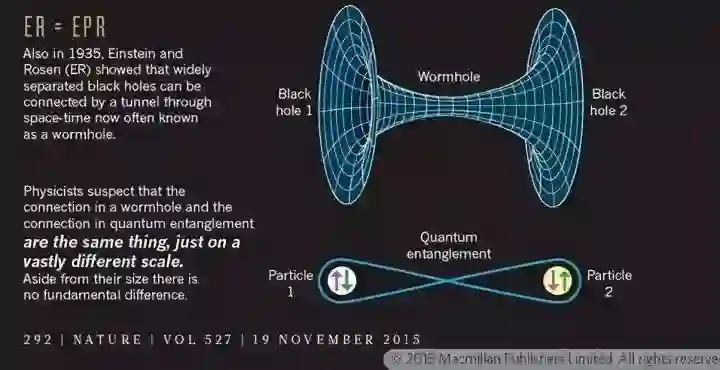 虫洞是广义相对论的产物。然而,广义相对论并没有告诉我们虫洞是如何产生的。于是,物理学家想到了利用规范/引力对偶将这一问题转移到量子的角度去分析。2013 年,物理学家马尔达西那与合作者萨斯坎德(Leonard Susskind, 1940–)发表了一篇论文。他们发现,与虫洞相对应的量子现象正是我们早已为之困扰了很久的