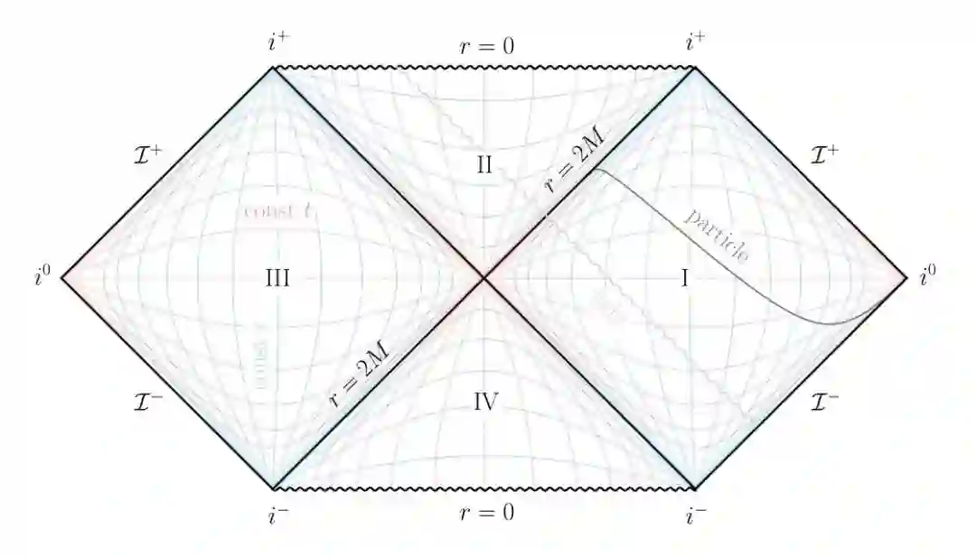 1960 年,克鲁斯卡尔(Martin Kruskal, 1925–2006)将史瓦西解进行了拓展,构造了所谓的克鲁斯卡尔延拓,大概是图 2 那个样子。图 2 中右侧用罗马数字 I 标记出来的菱形区域是黑洞以外的宇宙,而上方用罗马数字 II 标记的倒三角区域便是一个黑洞。除此之外,克鲁斯卡尔延拓还包含了两个镜像的区域:区域 III 是一个镜像的宇宙,而区域 IV 便是黑洞的镜像,我们称之为