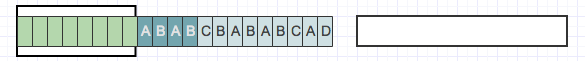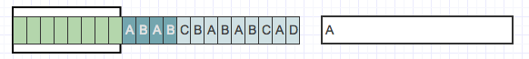 LZ77的主要算法逻辑就是,先通过前向缓冲区预读数据,然后再向滑动窗口移入(滑动窗口有一定的长度),不断的寻找能与字典中短语匹配的最长短语,然后通过标记符标记。我们还以字符ABD为例子,看如下图: