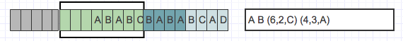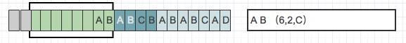 4、缓冲区字符(ABCB)在滑动窗口的位移6位置找到AB,成功匹配到短语AB,将AB编码为(6,2,C)