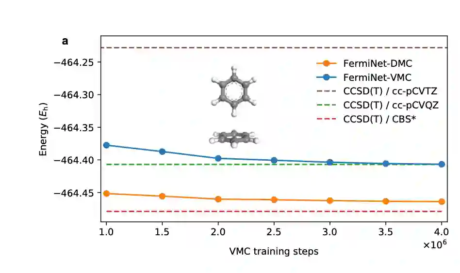本工作公开前,量子化学领域中基于变分蒙特卡洛的神经网络波函数方法只处理过 30 电子以内的小型分子。本工作首次将神经网络波函数方法应用于 42~84 个电子的体系,即苯环与双苯环。计算结果显示,扩散蒙特卡洛方法在精度上显著优于变分蒙特卡洛方法,同时可以用少一个数量级的计算步数达到相同或更优的精度。