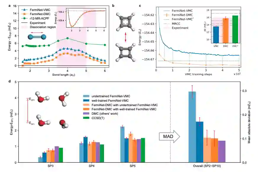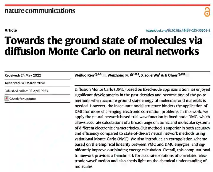 扩散蒙特卡洛方法是量子化学领域精确计算分子和材料基态能量的常用方法之一。通过与扩散蒙特卡洛方法结合,作者显著提高了量子化学中神经网络 SOTA 方法的计算精度与效率。此外作者还提出了一种基于经验线性关系的外推方法,大幅改善了分子结合能计算。总体而言,该计算框架作为求解量子多体问题的高精度方法,为化学分子性质的深入理解提供了更强大的工具。