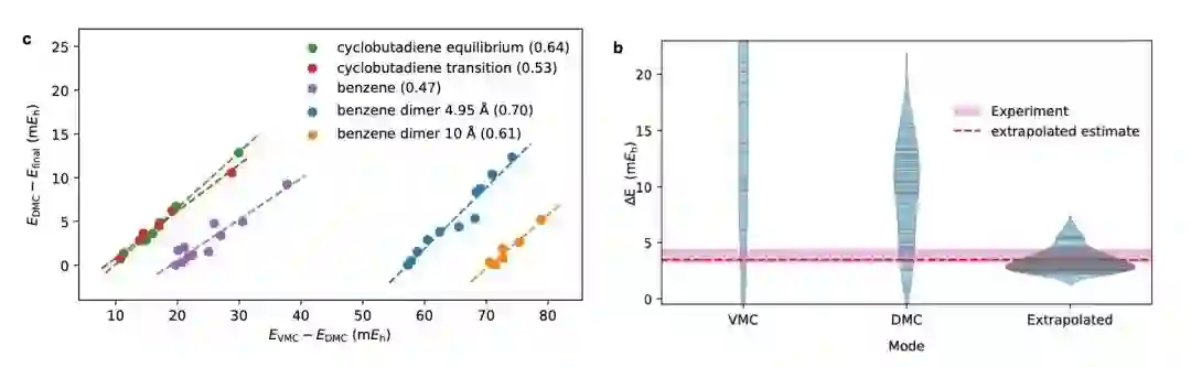 作者在考察神经网络的不同训练阶段所对应的能量时,在很多体系上均发现变分蒙特卡洛与扩散蒙特卡洛的计算结果具有经验性的线性关系(下左图)。使用该线性关系对双苯环的解离能计算进行外推,显著提升了计算精度,得到了吻合于化学实验的结果(下右图)。
