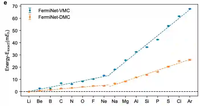 使用神经网络对大型分子体系进行量子蒙特卡洛计算时,由于算力限制,所能使用的神经网络的表达能力也会受到一定限制。为了模拟这一场景,作者使用了仅仅两层的神经网络来研究第二、三排的原子。计算结果显示随着体系变大,变分蒙特卡洛方法的精度愈来愈差,而扩散蒙特卡洛方法所带来的精度提升也愈来愈明显。