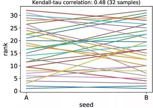 作者先随机采样得到 32 个不同的网络结构,然后用两个不同的随机数种子进行训练,结果如下图所示,换了种子之后不同模型的性能差的还挺多。