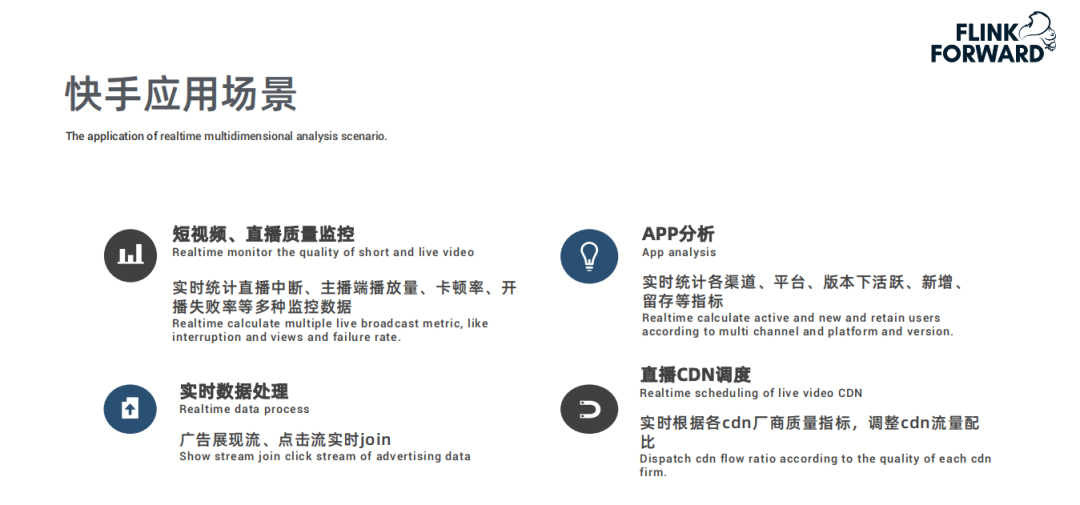 快手是分享短视频跟直播的平台,快手短视频、直播的质量监控是通过 Flink 进行实时统计,比如直播观众端、主播端的播放量、卡顿率、开播失败率等跟直播质量相关的多种监控指标;