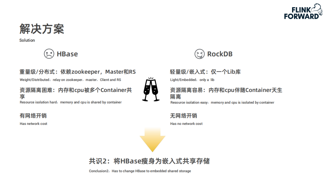 由于出现上文阐述的问题,开始寻找解决方案,整体思路是在数据写入时直接落地到共享存储中,避免 Checkpoint 带来的数据拷贝问题。手段是尝试使用更省 IO 的 Compaction,例如使用 SizeTieredCompation 方式,或者利用时序数据的特点使用并改造 FIFOCompaction。综合比较共享存储、SizeTieredCompation、基于事件时间的 FIFOCompaction 以及技术栈四个方面得出共识:HBase 代替 RocksDB 方案。