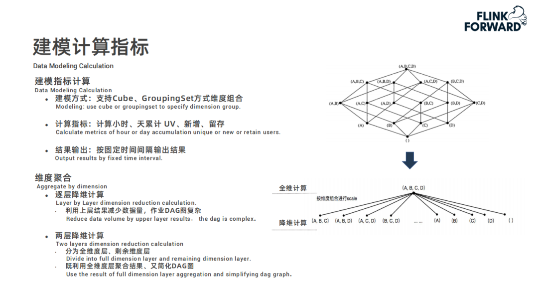 数据预处理完成后,最重要的步骤是进行建模指标计算,此处支持 Cube、GroupingSet 方式维度组合来计算小时或者天累计的 UV ( Unique Visitor )、新增和留存等指标,可以根据用户配置按固定时间间隔定期输出结果;维度聚合逻辑中,通过逐层降维计算的方式会让 DAG 作业图十分复杂,如上图右上角模型所示;因此快手设计了两层降维计算模型,分为全维度层和剩余维度层,这样既利用了全维度层的聚合结果又简化了 DAG 作业图。