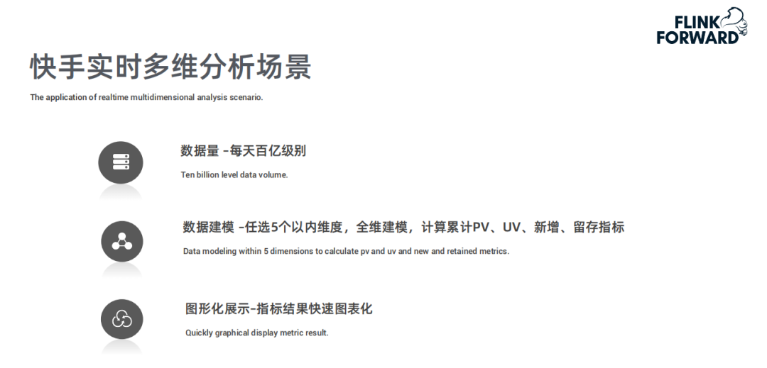 快手内部有这样的应用场景,每天的数据量在百亿级别,业务方需要在数据中任选五个以内的维度组合进行全维的建模进而计算累计的 PV ( Page View 访问量 )、UV ( Unique Visitor 独立访客 )、新增或者留存等这样的指标,然后指标的计算结果要实时进行图形化报表展示供给业务分析人员进行分析。