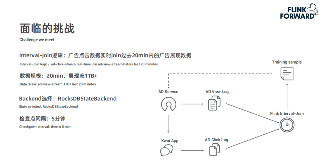 首先看一下 Flink 使用 RocksDB 遇到的问题,先阐述一下快手的应用场景、广告展现点击流实时 Join 场景:打开快手 App 可能会收到广告服务推荐的广告视频,用户可能会点击展现的广告视频。这样的行为在后端会形成两份数据流,一份是广告展现日志,一份是客户端点击日志。这两份数据进行实时 Join,并将 Join 结果作为样本数据用于模型训练,训练出的模型会被推送到线上的广告服务。该场景下展现以后20分钟的点击被认为是有效点击,实时 Join 逻辑则是点击数据 Join 过去20分钟内的展现。其中,展现流的数据量相对比较大,20分钟数据在 1TB 以上。检查点设置为五分钟,Backend 选择 RocksDB。