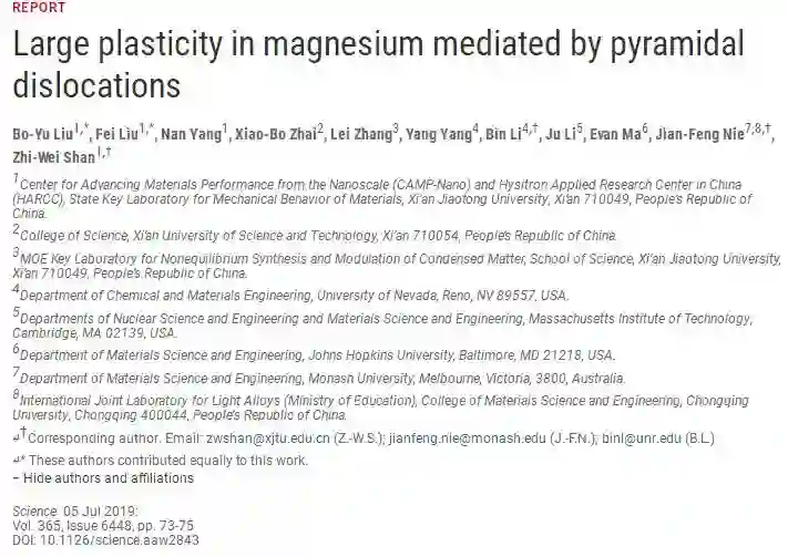 北京时间7月5日凌晨,《科学》杂志刊发西安交通大学单智伟教授团队最新研究成果:塑性差并不是镁的固有属性,通过提高流变应力(如通过细化晶粒或提高应变速率)来促进位错形核和滑移,可能是行之有效的增塑方法。西安交通大学青年教师刘博宇博士为本论文的第一作者,博士研究生刘飞为共同第一作者,西安交通大学单智伟教授、澳大利亚莫纳什大学聂建峰教授和美国内华达大学李斌教授为共同通讯作者。