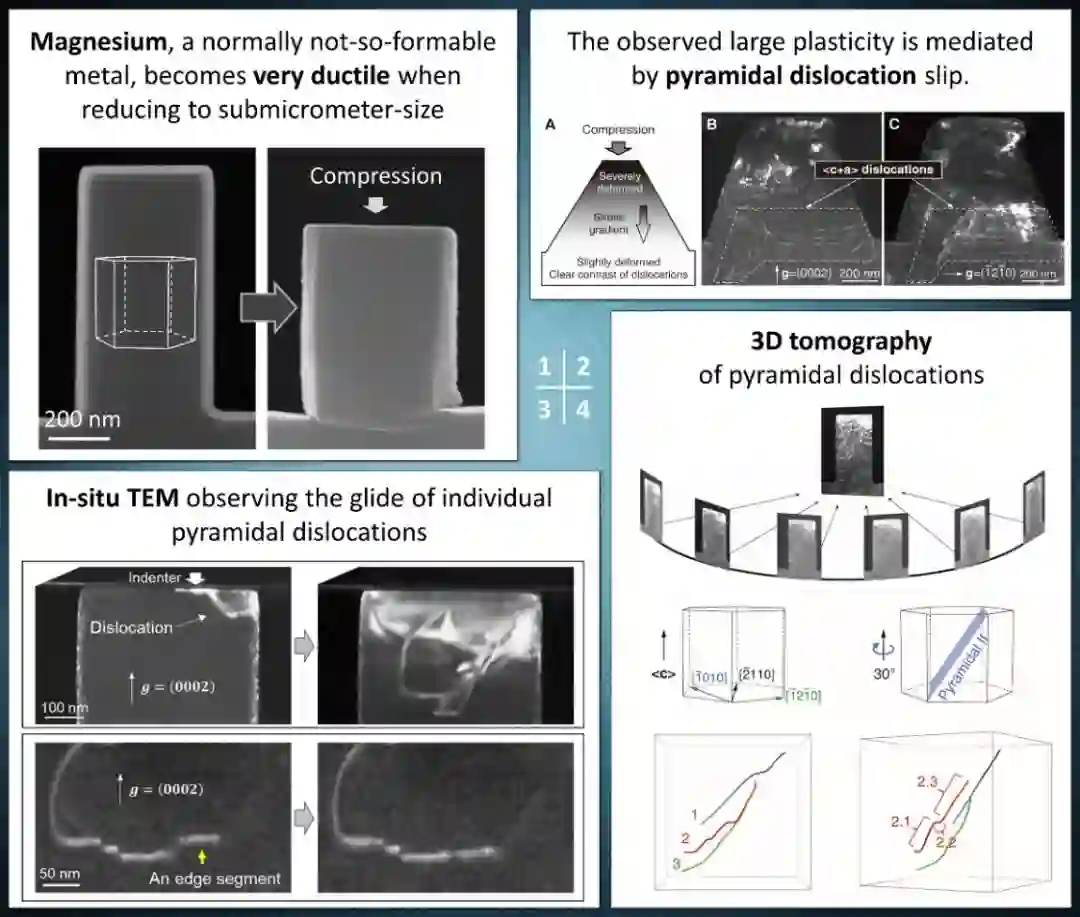 图1:亚微米尺寸镁的大塑性变形;图2 实验观测到的塑性变形是由锥面位错滑移主导的;图3:原位电镜捕捉到单根锥面位错的滑移;图4 三维图像重构帮助解析锥面位错的形态及其滑移面。