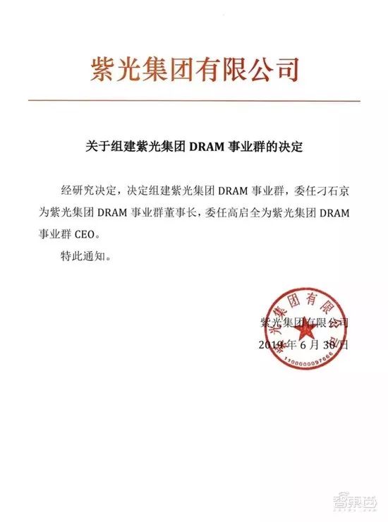 智东西7月1日消息,昨晚11点紫光集团宣布组建DRAM事业群,委任刁石京为紫光集团DRAM事业群董事长,委任高启全为紫光集团DRAM事业群CEO。