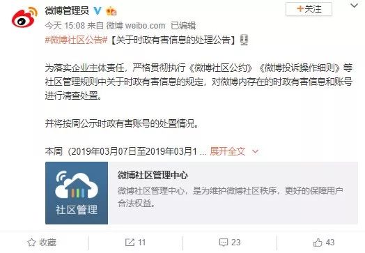 4. 微博处置时政有害信息,7天37个头部账号被处理
