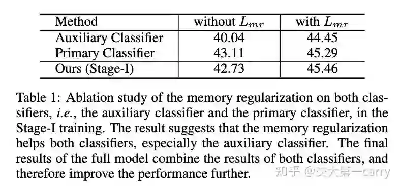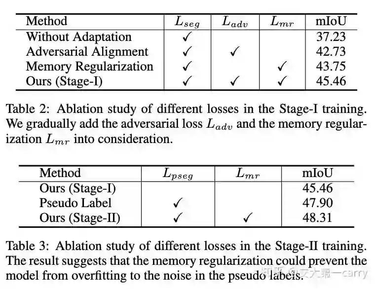 这是一个常用的打勾表,逐渐加上不同的损失项,结果慢慢提升。值得注意的是光用memory regularization结果就比光用特征对齐高了!