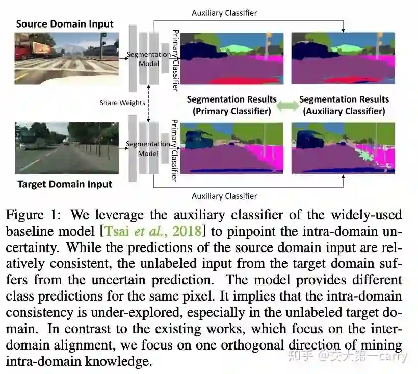同时,如下图,他们发现在对没有标注的目标域图像上,基于对齐的方法,预测结果往往是抖动的,这也说明了目标域本身的特征Consistency并没有随着特征对齐而 自然而然的学到。