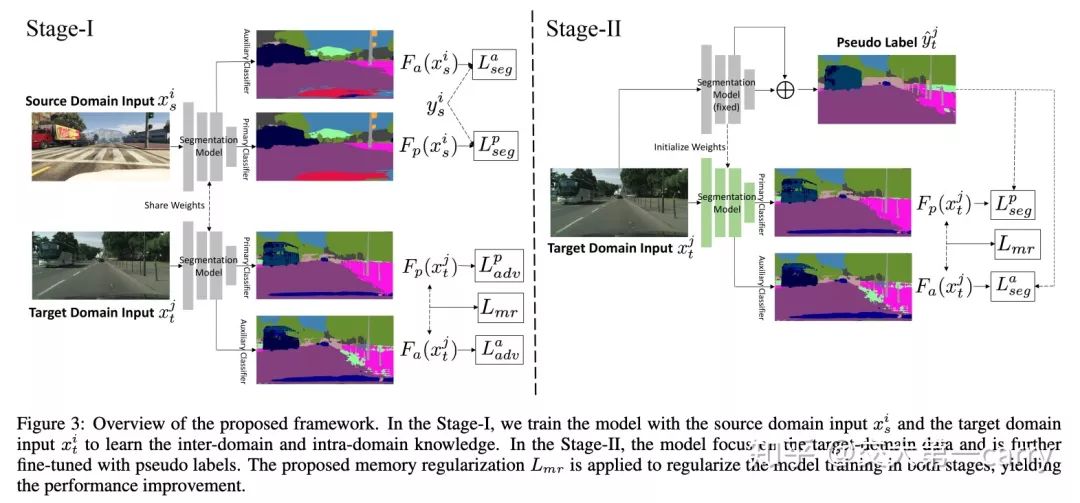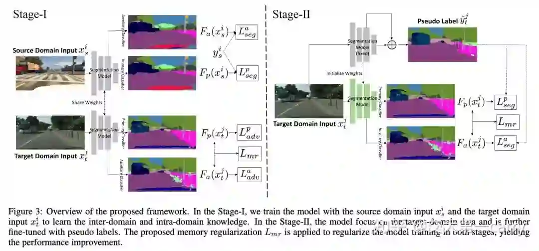 其中第一阶段采用的是feature alignment结合,利用对抗损失要求特征对齐,挖掘inter-domain的共享的特征;在这个阶段memory regularization 是去挖掘intra-domain的特有特征