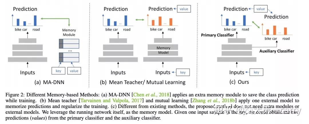 作者利用了memory term来正则网络训练,具体什么是memory?我们从相关工作说起,MA-DNN是一个半监督的CNN训练方法,提出用一个look up table来存每一类的特征向量,类似center loss里面weight的感觉,但是是使用一个外部module,采用moving average来更新;而CCF优秀论文 deep mutual learning 和 mean teacher 两个semi-supervised常用的方法,则可以看成利用了一个模型来代替look up table,本质上也是输入一个input,得到一个value。此时input可以看成MA-DNN的key。