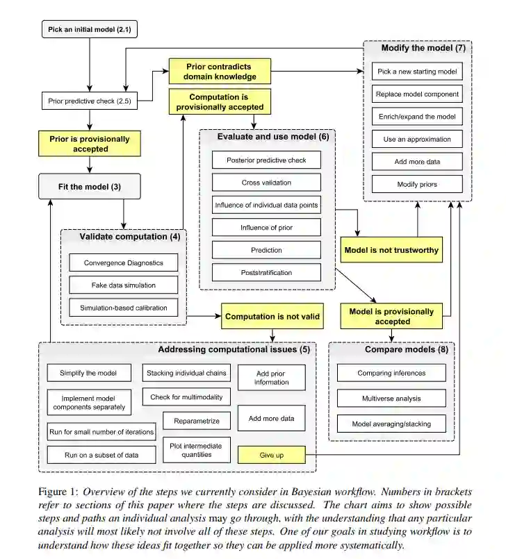 数据分析的贝叶斯方法提供了一种使用概率论处理所有观测、模型参数和模型结构中的不确定性的强大方法。概率编程语言使指定和拟合贝叶斯模型变得更容易,但这仍然给我们留下了许多关于构建、评估和使用这些模型的选择,以及计算中的许多剩余挑战。使用贝叶斯推理解决现实世界的问题不仅需要统计技能、主题知识和编程,还需要了解在数据分析过程中所做的决策。所有这些方面都可以理解为应用贝叶斯统计的复杂工作流程的一部分。除了推理,该工作流程还包括迭代模型构建、模型检查、计算问题的验证和故障排除、模型理解和模型比较。我们在几个例子的背景下回顾了工作流的所有这些方面,记住在实践中,我们将为任何给定的问题拟合许多模型,即使只有其中的一个子集最终与我们的结论相关。