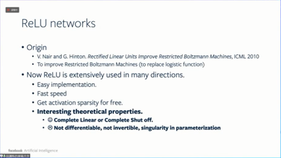今天我们讨论ReLU 网络,ReLU激活函数在神经网络的应用非常广泛。因为它很容易实现,而且学习比较快,能自然地实现网络稀疏性。除此之外,它还有一些非常有趣的理论性质,并且它的函数性质对理论分析来说有好处。当然,它也有不足的地方,比如说不可微的、不可逆,存在参数化奇点等。