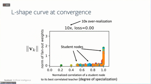 下图是另外一个实验的结果,横轴是学生网络节点和最佳关联教师网络节点之间的相关程度,纵轴是输出权重的范围。从图中我们可以看出,这两个变量形成了“L”形曲线关系。如果学生节点和教师节点没有太大关联,那它输出权重的范数就很小,反之则有很强的关联。