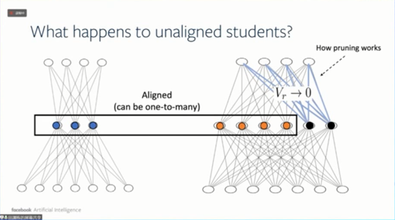 可以证明在满足某些条件时,那些没有对齐的学生网络节点(下图的黑色点),它的输出权重会是0,这就给我们提供了如何对神经网络进行剪枝的理论基础。