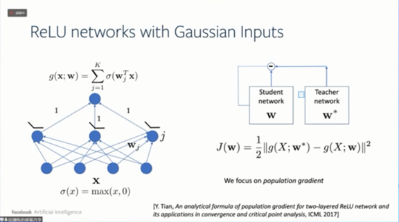 接下来讨论ReLU网络在学生-教师设置下的理论性质。设置是什么意思呢?举个例子,比如监督学习。在监督学习设置中,我们有将x标记为y的数据集,然后我们训练一个神经网络,输入x能得到y。