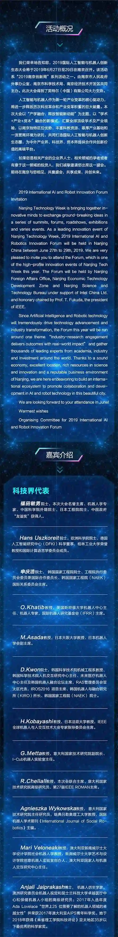 本次大会立足南京市“121”战略实施与国际化建设新成就,瞄准人工智能与机器人学研领域世界领先国家,开启以南京为中心的全球学研网络布局。中科院外籍院士、世界电气电子工程师协会全球主席福田敏男教授,欧洲科学院院士、德国人工智能研究中心科学董事Hans Uszkoreit教授,韩国工程院院士、工程院执行委员会委员兼国际合作委员长申庆浩教授、美国斯坦福大学机器人中心主任、国际机器人研究基金会主席奥萨玛教授、意大利国家技术研究院副院长G.Metta教授、澳大利亚新南威尔士大学社会机器人学Mari Veloneaki教授等40余位国外著名专家将分享全球顶尖学研成果,推动南京成为国际人工智能与机器人学研巅峰城市。