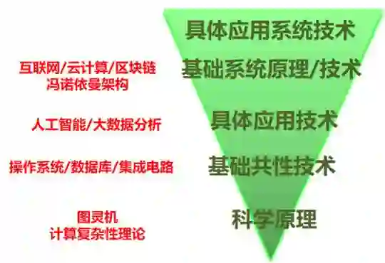 以上各层的产出,都还不能直接服务于人。所以在它们之上,还有把技术变成实用产品/系统的原理与技术。在此为了简便我们只分了两层。特别需要指出的是,由于人工智能等技术属于具体应用技术,而不是系统级技术,所以事实上它们自己无法成为构造实际应用系统/产品的基础,而必须依附于系统级原理与相关技术才能发挥作用。虽然当初有过主要基于人工智能技术构造系统的努力,比如日本的第五代计算机,今后这种努力也不会完全消失。但是,从人工智能技术的客观本质来看,将其作为具体层面的应用技术来使用,才是合理的选择。