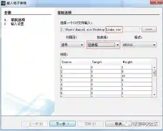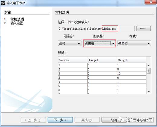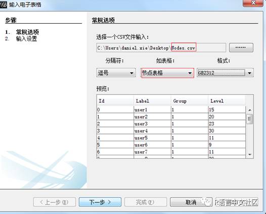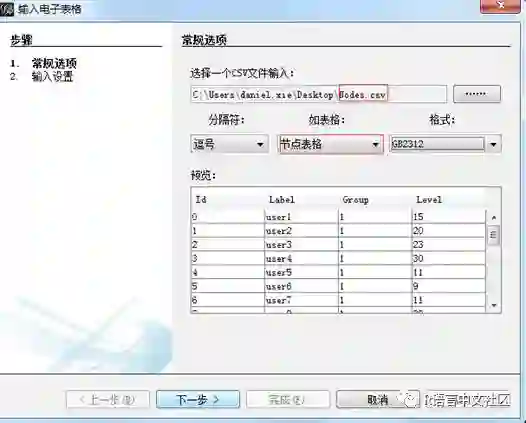 现在,我们通过Gephi工具来对某款游戏的社交性进行分析。首先新建一个项目,然后在数据资料选择中,点击输入电子表格,将节点数据集Nodes和边数据集Links导入到Gephi中: