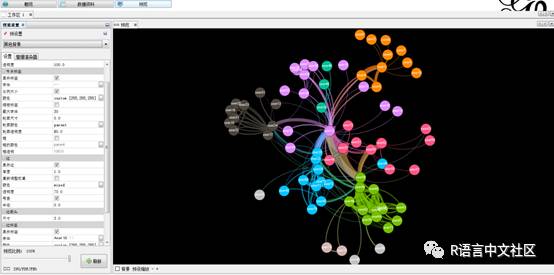 自动生成的网络图相对来说比较简单,我们利用左上角的外观设置来改变节点颜色。方法是在数值设定的选择一种渲染方式的下拉框中选择Group,让不同组别节点用不同颜色表示;并点击图下方的T按钮,显示节点标签。