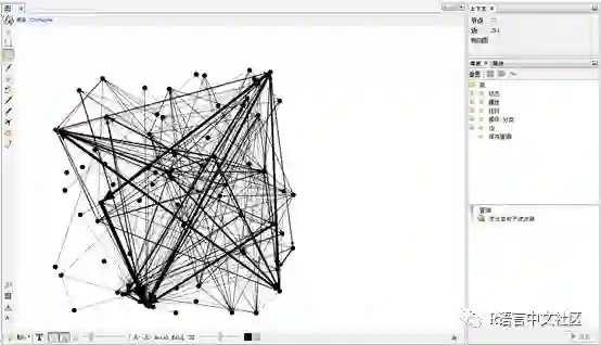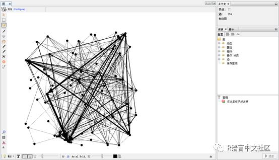 当我们把数据导入到Gephi后,在概览的图窗口已生成一个简单网络图,右上角显示了一共有77个节点和254条边,创建的是有向图。