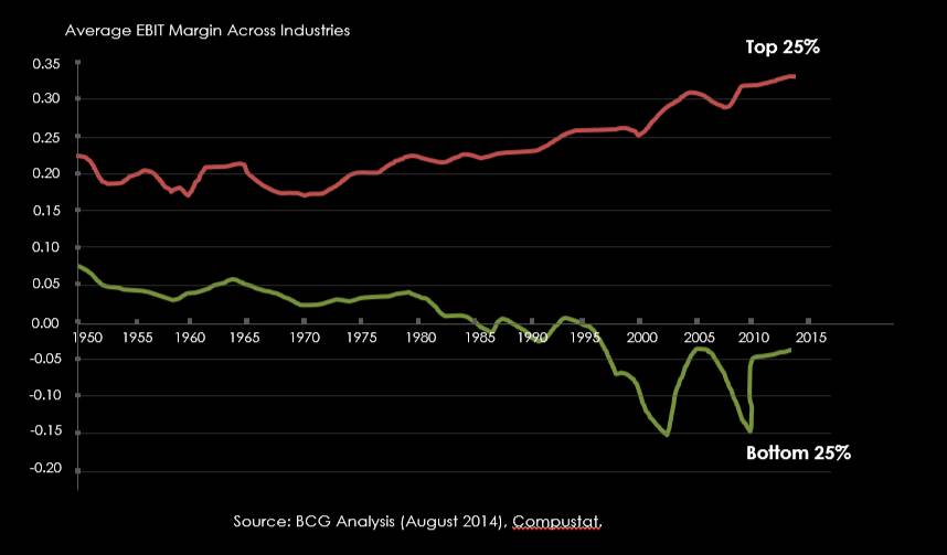 上市公司里表现最优异的四分之一,他们的EBIT趋势从1950年的20%左右在不断上升。表现最优异的四分之一的样本,他们的平均EBIT在不断上升到现在超过了30%。